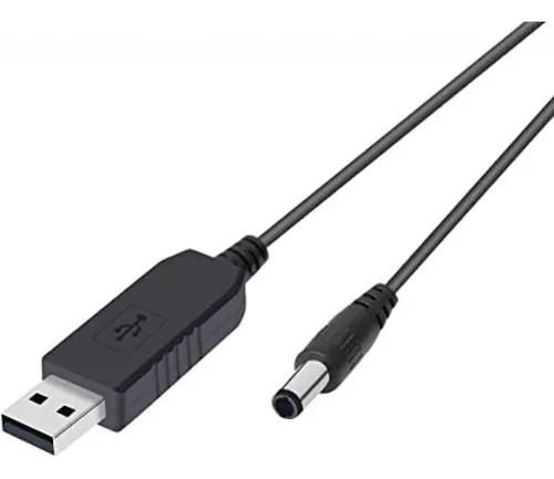 Es un cable que tiene un conector USB en un extremo y un conector de corriente de 3.5mm en el otro extremo. El conector USB se conecta a un puerto USB de tu mini UPS (si tiene uno), y el conector de 3.5mm se conecta al dispositivo que necesita ser alimentado.