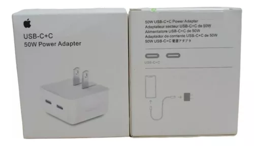 Es un adaptador de corriente que se conecta a la pared y que tiene un puerto USB-C. Este puerto USB-C se utiliza para conectar un cable de carga USB-C a Lightning (se vende por separado) que va a tu iPhone. La potencia de 50W permite una carga más rápida que los cargadores de 5W o 20W que suelen venir incluidos con los iPhones.