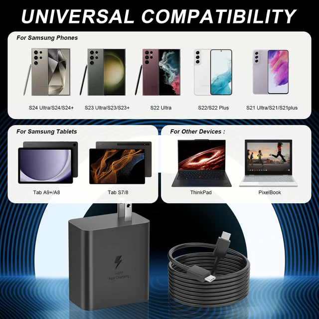 - Compatible con modelos Galaxy, Android y Apple: cargador de teléfono de 45 W de carga súper rápida Galaxy S24 Ultra, S24, S24+, S23 Ultra, S23, S23+, Galaxy S22 Ultra, S22, S22+, S21 Ultra/ S21/ 21+/ S20 Ultra, Galaxy S20/ S20+/ S20 FE, Nota 20/ 20 0+/ 10+/ 10+ 5G/ S10 5G, Note 10/ 9/ 8, Galaxy Tab S7/S7+/S8/S8+/S8 Ultra, Z Fold 4/ Z Flip 4, Galaxy A91, Galaxy Z Fold 3 5G, Pixel 5 / Pixel 4xl, otros dispositivos USB C y más dispositivos compatibles en el futuro.