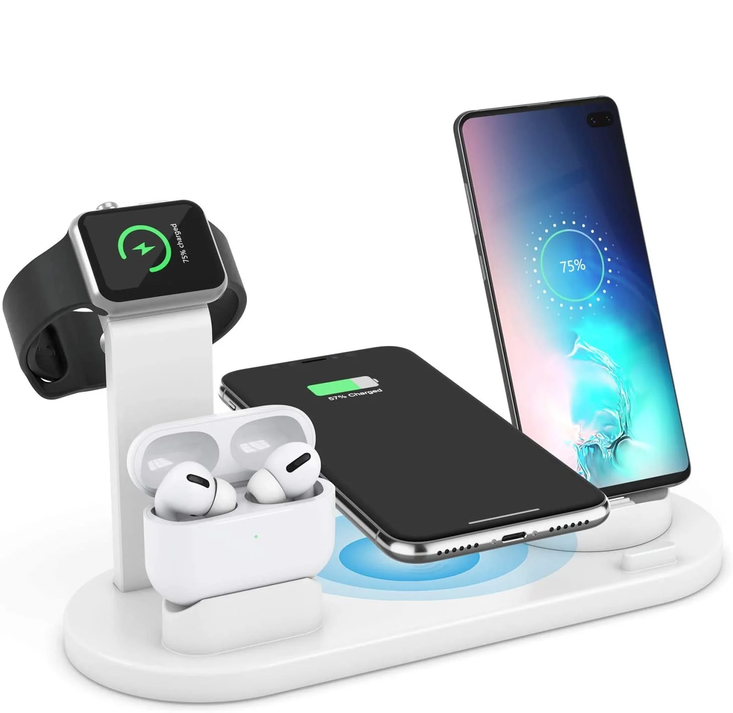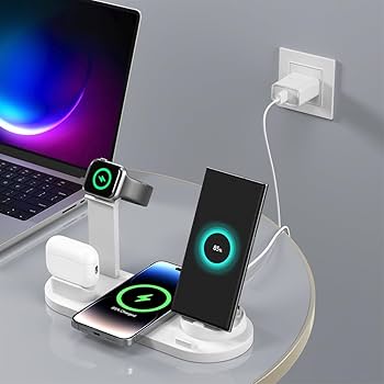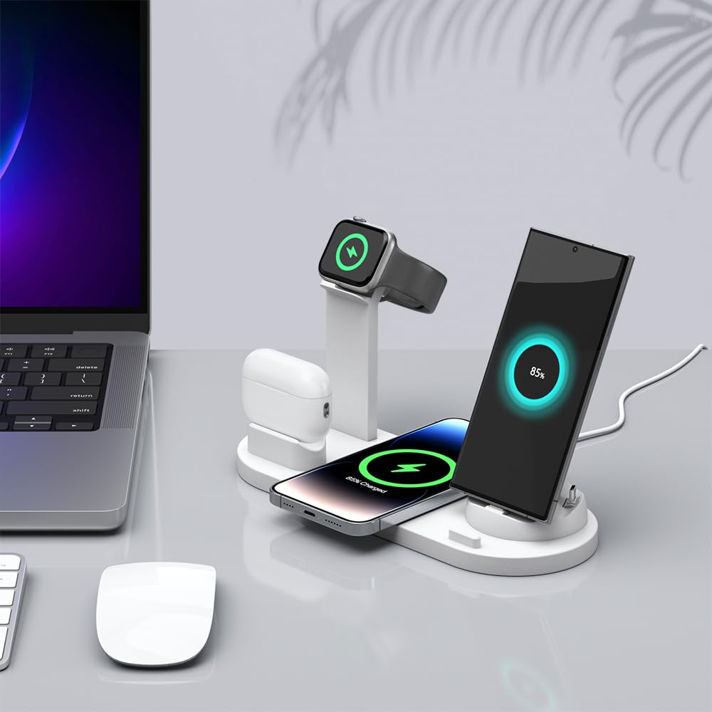 - Diseño Multifuncional: Permite cargar hasta 4 dispositivos simultáneamente: teléfono, Apple Watch y AirPods.
